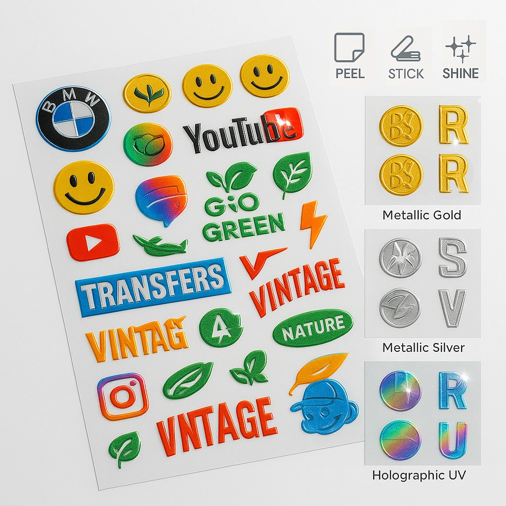 Printed with precision and layered UV varnish, these stickers deliver a raised, glossy 3D texture that makes any logo or design stand out.